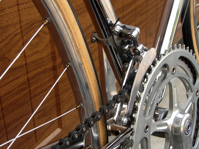 I shipped this bike down to North Carolina for the Classic Rendezvous weekend. It rode beautifully. I was really grooving on the legendary Cinelli ride. However, about 15 miles into the 36 mile "intermediate" level ride, I noticed it was getting harder to keep up with my fellow 50-year-old-beer-gutted-tree-stump-legged com padres. I looked down and noticed my rear Clement Criterium tire was going flat. Now, who would guess that a 40 or 50 year old tubular tire would possibly go flat on a long ride? After all the damn thing is N.O.S.! Naturally, I brought neither a spare, nor a pump with me on the ride. I was never a good boy scout. The fast guys ahead of me were long gone, and no one behind me had a tubular spare. So, I had to wait for a friend with a sag-wagon to pick me up and never finished the ride. My friend who sold me the original tires happened to be at the event, and was happy to take some more cash off me for a replacement. I just got the bike back from North Carolina, along with another choice little piece I picked up at the swap meet - stay tuned.